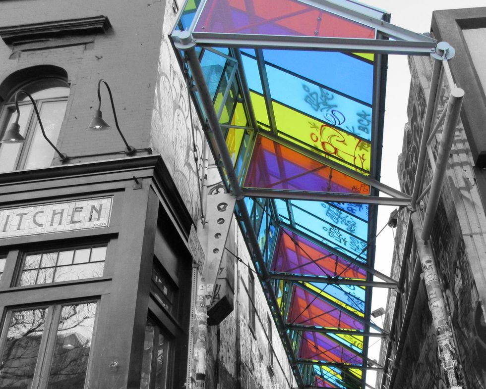 Adorn by simple skylights, the alley is colorful, vibrant, nearly chaotic in design, and easy to miss. The plan brick walls of the adjacent buildings define the space with light pouring into the alley from above, there's little to dissuade an artist from adding his or her work to the alley. It takes full advantage of the short-lived lifespan of street art and cycles on a weekly basis nearly from professionals to amateurs. It's a space for the user's creativity to fester into product and ideas to be put onto stone.