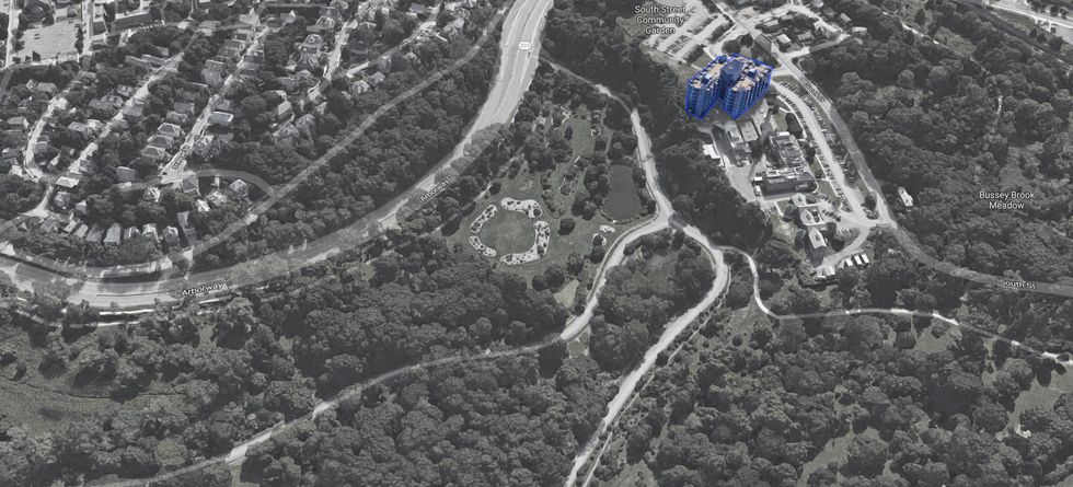 Note the radically different construction of this garden. There's neighborhoods of Jamaica Plain nearby and brutal concrete structures for medical and MBTA buildings. But not the diffusion my a counterbalance in vegetation. The vegetation blends architecture into nature by a series of concealing and revealing. The forest's nonuniform structure means songs like New Slang sustains the atmosphere and harmony in architecture and nature. The specific building is the State Lab, an institution anchored to the garden and a prime example of perception to architecture changing based on music.