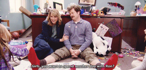 It is abundantly clear throughout the show that Ron Swanson is no fan of children; however, when Diane makes it clear that Ron cannot have her without her daughters, Ron struggles and finds motivation to spend time with the loud, rambunctious girls. It is clearly not his favorite thing to do, but he marks how important it is to Diane that he bond with them, and after time, begins to see them as his own. In relationships, we will often have to bear with things we do not wildly enjoy, but seeing our partner's eyes light up with joy should remind us why the sacrifice is worth it.