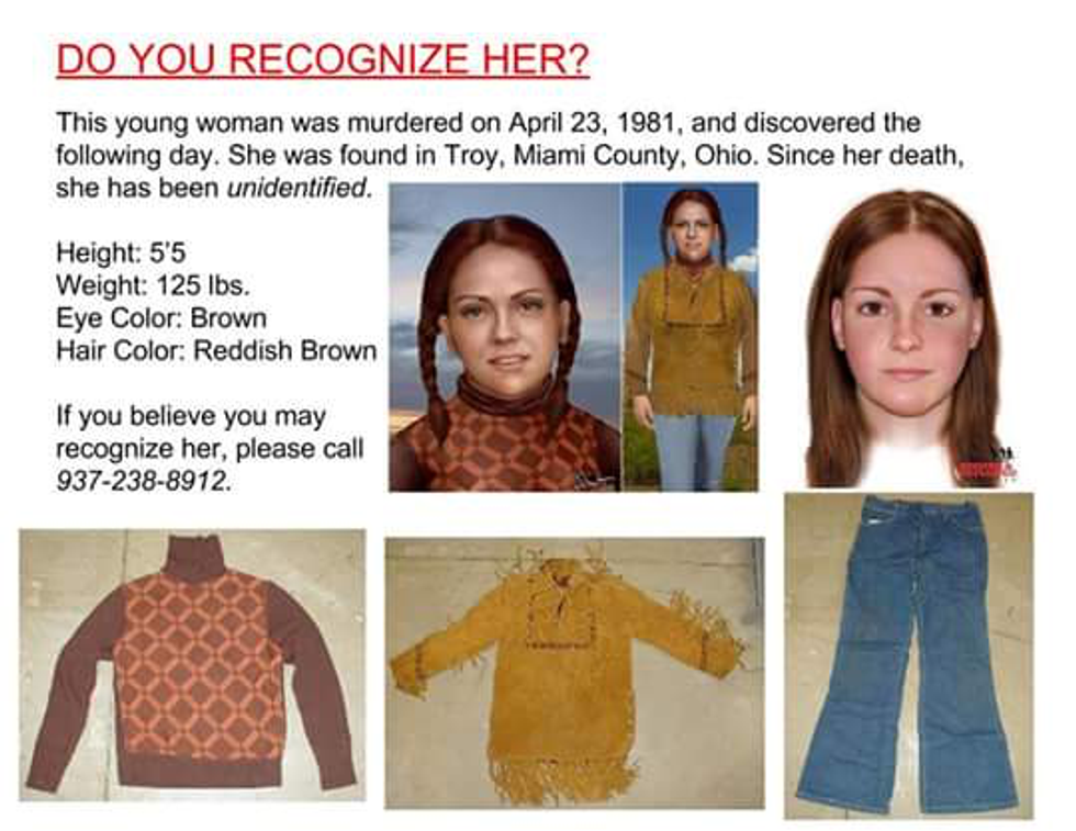 In 1891, a Miami County, Ohio resident discovered the lifeless body of a young woman on the side of a local road. The autopsy revealed the victim had died from strangulation and blunt force trauma to the head. Police considered this case a homicide and with hopes of recognition and ultimtately identification, released pictures of the distinct buckskin jacket the victim was wearing when found, earning her the name Buckskin Jane Doe.