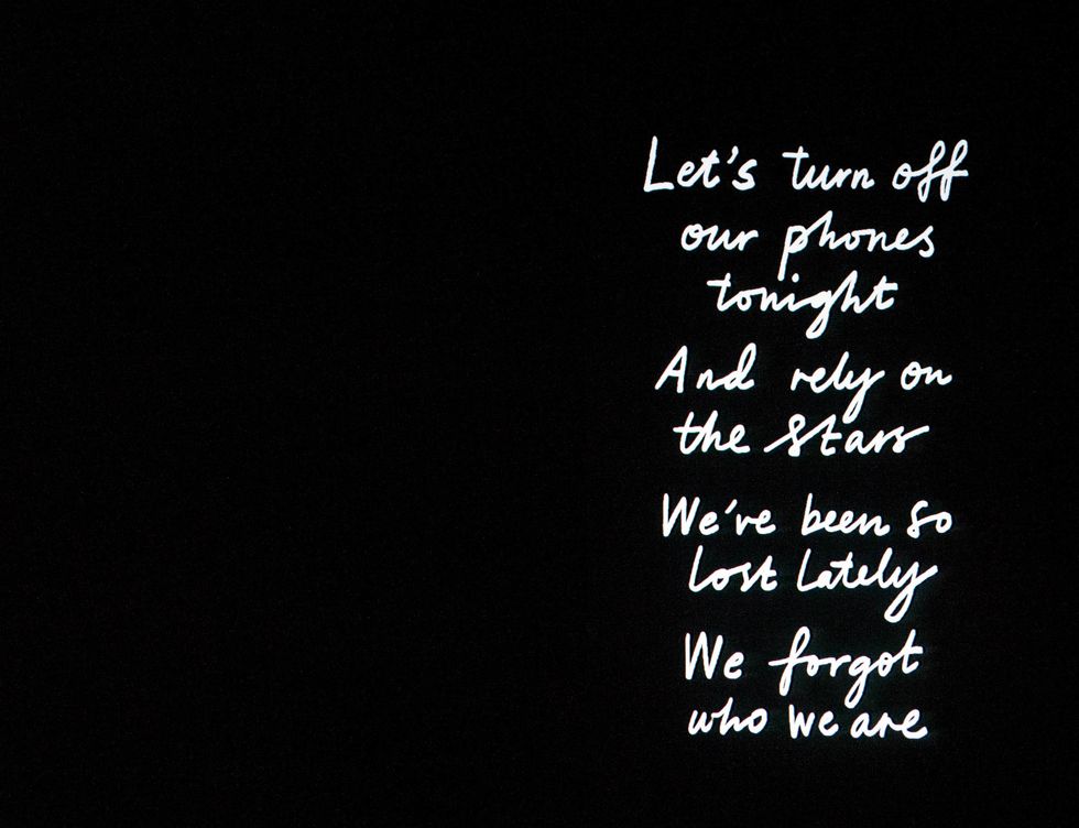 Not only did Sam take the stage with one of his emotional and powerful songs, but he made quite the entrance by rising from the floor. Moments before he rose, a message reading, "Let's turn off our phones tonight and rely on the stars. We've been so lost lately we forgot who we are" was projected onto the screens around the arena and read by the 11,000+ in attendance at the Xcel Energy Center.