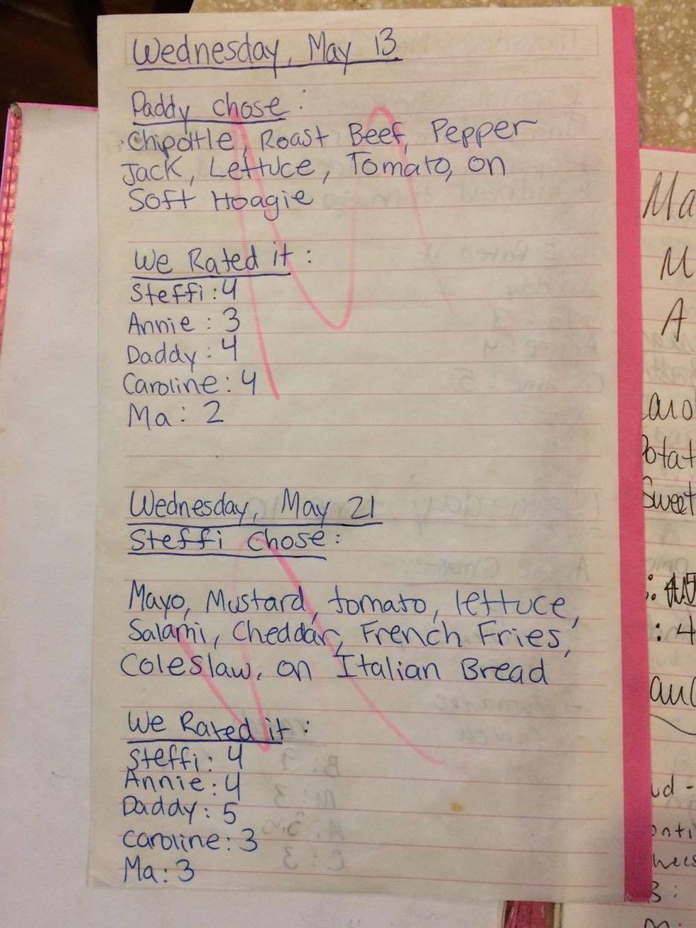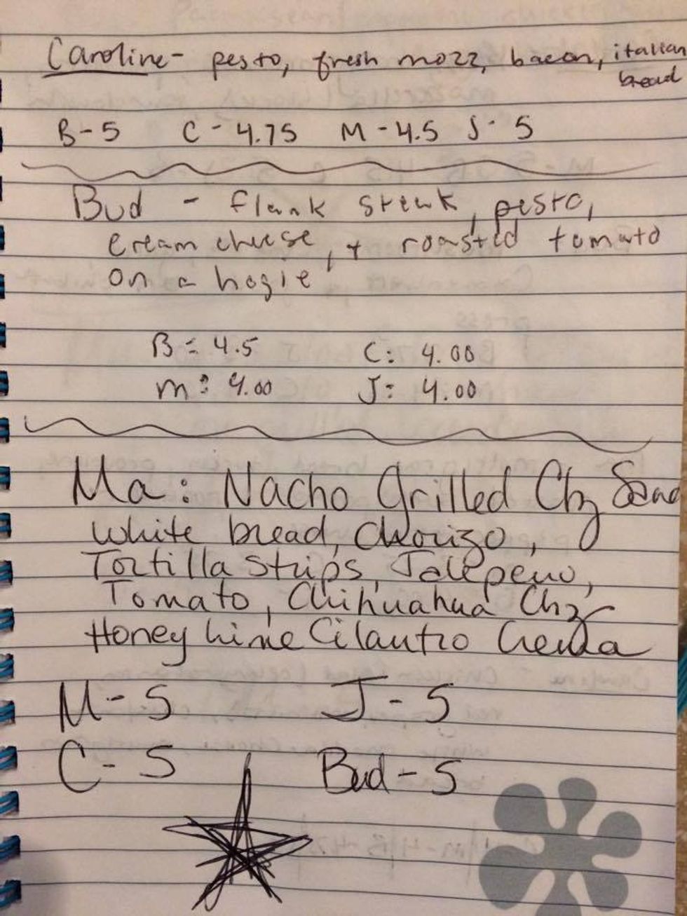 The final rule was that we had to rate every sandwich. This is for real. We have two full notebooks at my house right now, one complete with "sandwiches" misspelled on the cover, completely filled up with pages and pages of sandwich recipes and ratings. See for yourself.