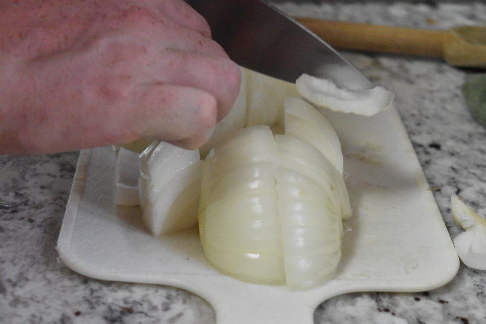 You can pretend to be mourning the death of your garden, but onion is an unavoidable ingredient in a tomato sauce. If you don't want to cry, you can chop the onion into large chunks because their size does not matter in the end.