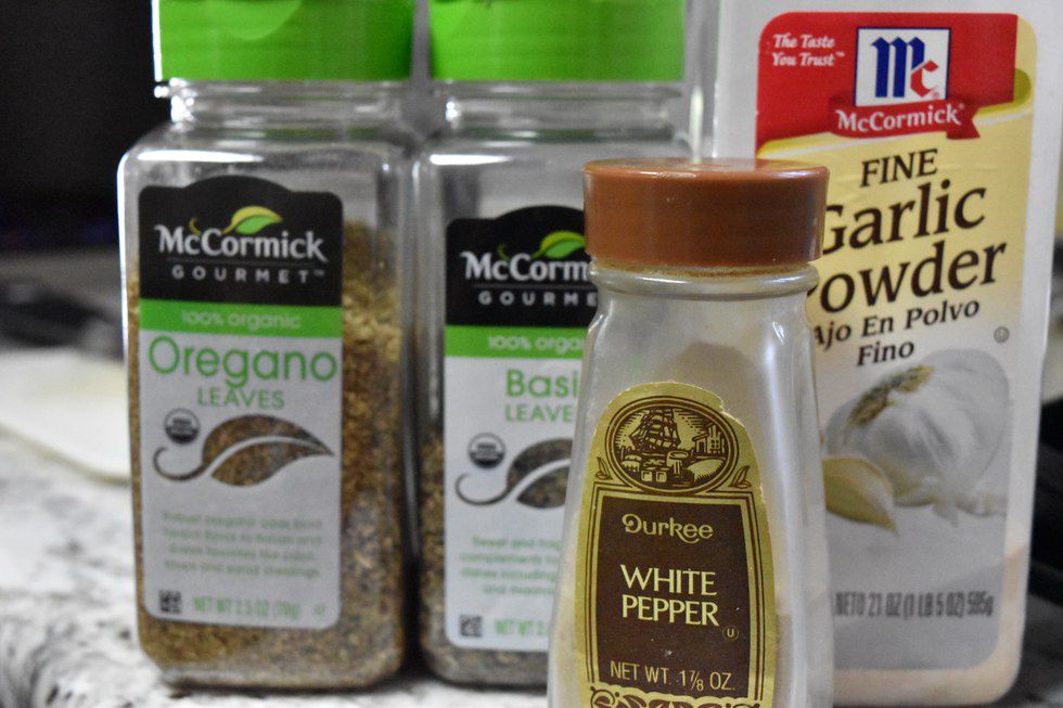 There are five main things to put into a tomato sauce: oregano, basil, garlic powder, white pepper, and (not pictured) sugar. The white pepper has a stronger flavor and is not as visually noticeable as black pepper, which is why it is a better choice if you have it. The garlic powder can be substituted for real garlic, adding the cloves in with the onion. Why sugar? It helps cut down on the natural acidity of the tomatoes. In true chef-like fashion, my brother has no sense of "teaspoons" and "tablespoons". It's all to taste, but less is more - you can add more later.