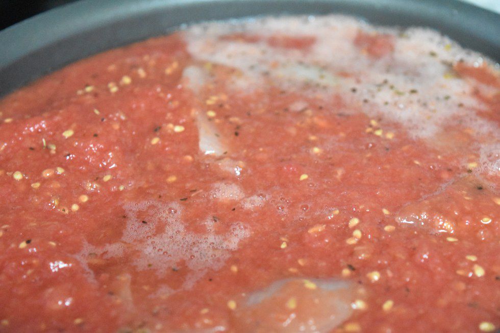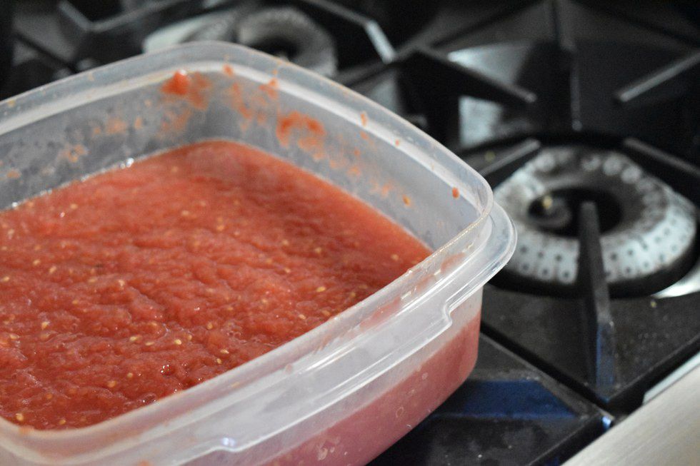Remember that red paste of blended tomato innards? There were a couple gallons of it taking up precious fridge space, reminding me of my time as a fruit-ecutioner. Thanks to a culinary-minded brother, it's been transformed into a great tomato sauce.