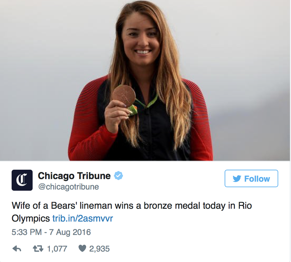 Trapshooter for the US Corey Cogdell- Unrein won her second bronze medal this summer at her third Olympic appearance. The Chicago Tribune announced her success with a tweet in which they referred to the Olympian as “Wife of Bears’ lineman”. Immediately they received backlash from the twitter-sphere, which pointed out the sexist nature of the tweet. Attention Chicago Tribune, she has a name.