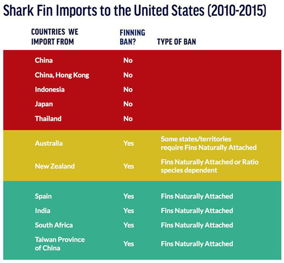 Shark finning is banned in U.S. waters, but sell and trade continues throughout the country. Commercial fishing for sharks are highly unregulated in other parts of the world as well. In fact, five of the 11 countries that export fins to the U.S. do not have shark finning bans, according to Oceana. By allowing this, it contributes to the problem.