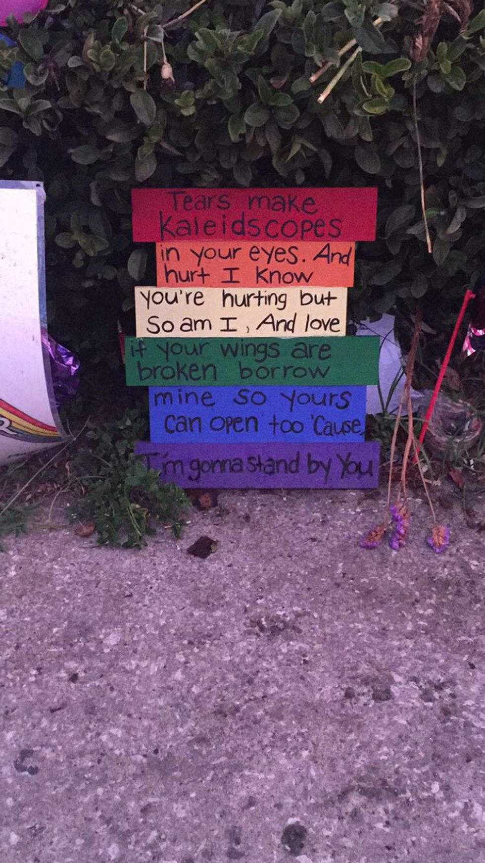 This brings me to my second reaction, love. There were many items at the memorial. Flowers, photos and even home-made memorandums. One that stuck out to me the most was a home-made sign, painted rainbow...