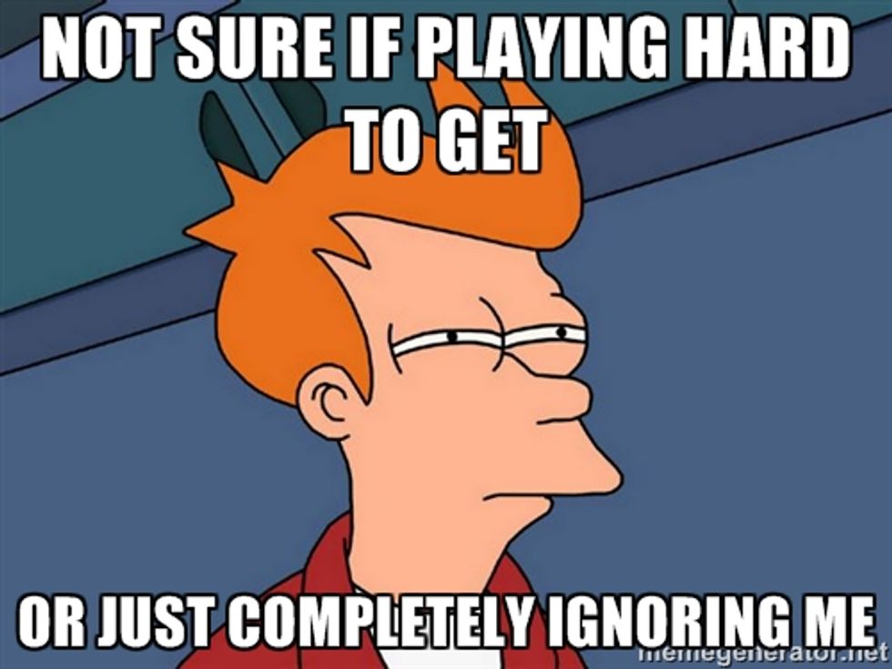 Girl's answer: Conceited, much? When we don't text you back for a while, it's not because we're trying to wait the perfect amount of time that makes you wonder. It's because we probably fell asleep or are really busy shoving food into our face. We need two hands for that.