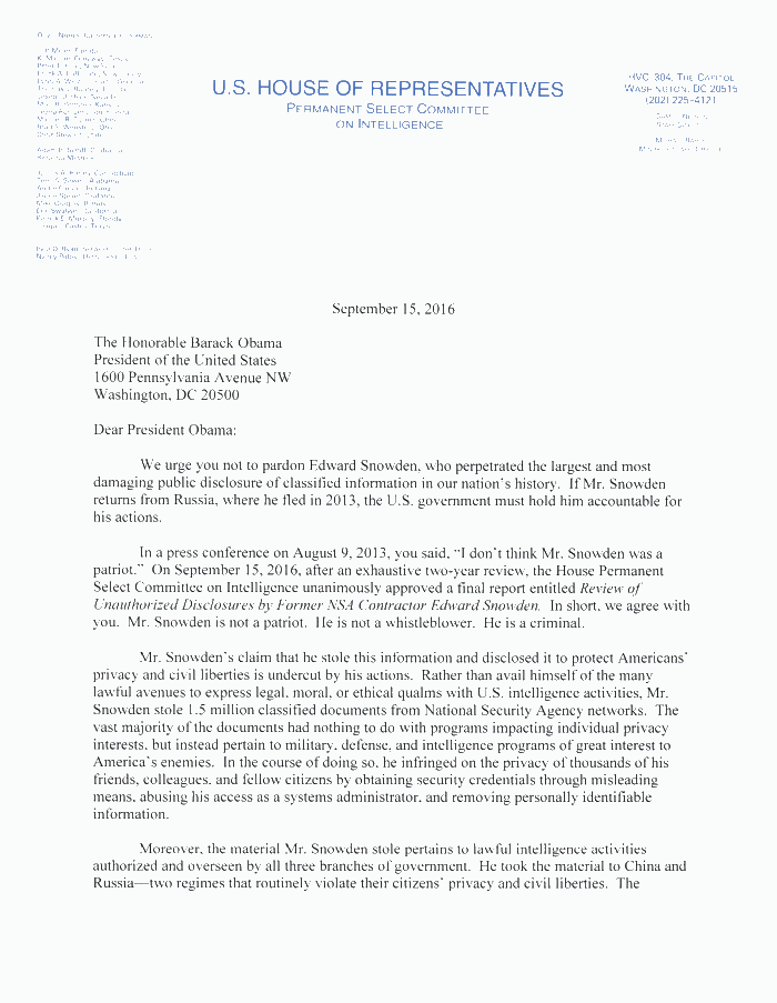 In the House Intelligence Committee letter to President Obama urging the president not to pardon Snowden they wrote “[Snowden] perpetrated the largest and most damaging public disclosure of classified information in our nation’s history.” They also claim that the majority of the documents Snowden downloaded do not have to do with privacy, but instead pertain to military, defense, and intelligence agencies. Ben Wizner, the American Civil Liberties Union lawyer representing Snowden, responds with the wide array of reports saying the N.S.A. were unaware of the documents that were taken. Based on a NPR interview, the House Intelligence committee also claims that Russia has secret files provided by Sowden, but Wizner has pointed out the allegation is uncorroborated.