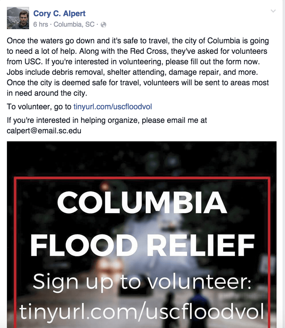 For all University of South Carolina students, there is a particularly unique opportunity for you to show some love and lend a hand to the Columbia community. USC student Cory Alpert has organized a way for University of South Carolina students to sign up to be involved in various community relief efforts.