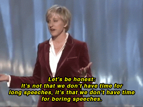 Let's face it: Ellen is an entertainer. She would never let us sit through boring speeches, she would just find new ways to brighten up our days.