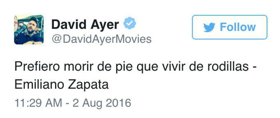 Overall, this film works. Ayer responded to the negative buzz on Twitter quoting Emiliano Zapata. In translation, Ayer says he'd rather die standing than live on his knees. At the end of the day, filmmakers are artists. They want to push the craft and make something they're proud of.