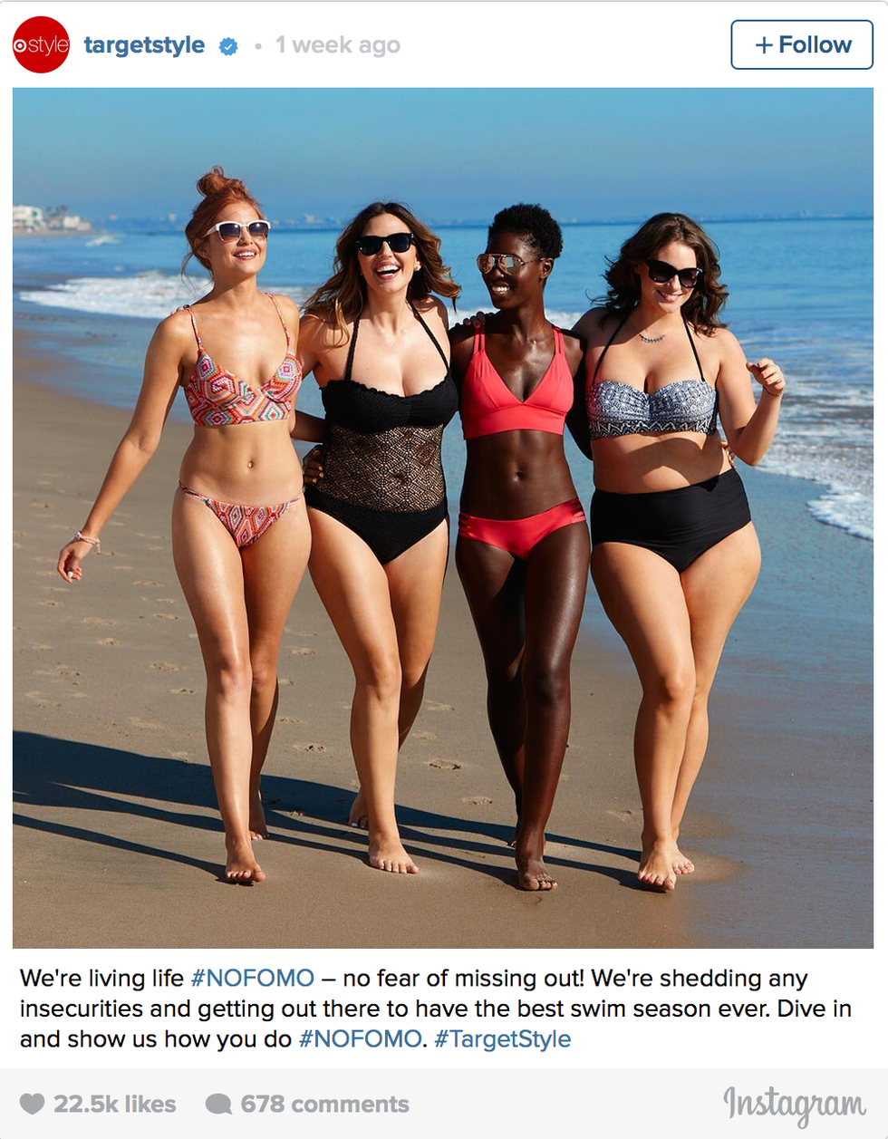 Cheers to you, Target, and cheers to all the beautiful women liberating and building each other up in this society that sets high standards, causing low self-esteem. No girl or woman should ever miss out due to being insecure of her body. This campaign is Target's plan to abolish #FOMO from our vocabulary this