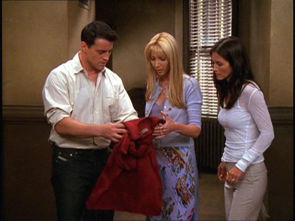 Not that we couldn’t have predicted it, but we can’t help but scream when Ross announces that the mystery red sweater is his.