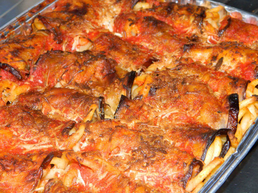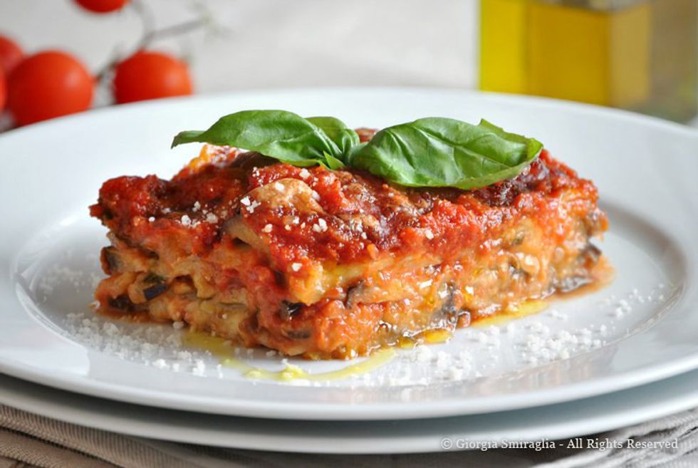 9. This meal is eggplant parmesan, slices of eggplants are layered with sauce, mozzarella, and eggs on top of every layer a chunk of parmesan. The more the merrier!