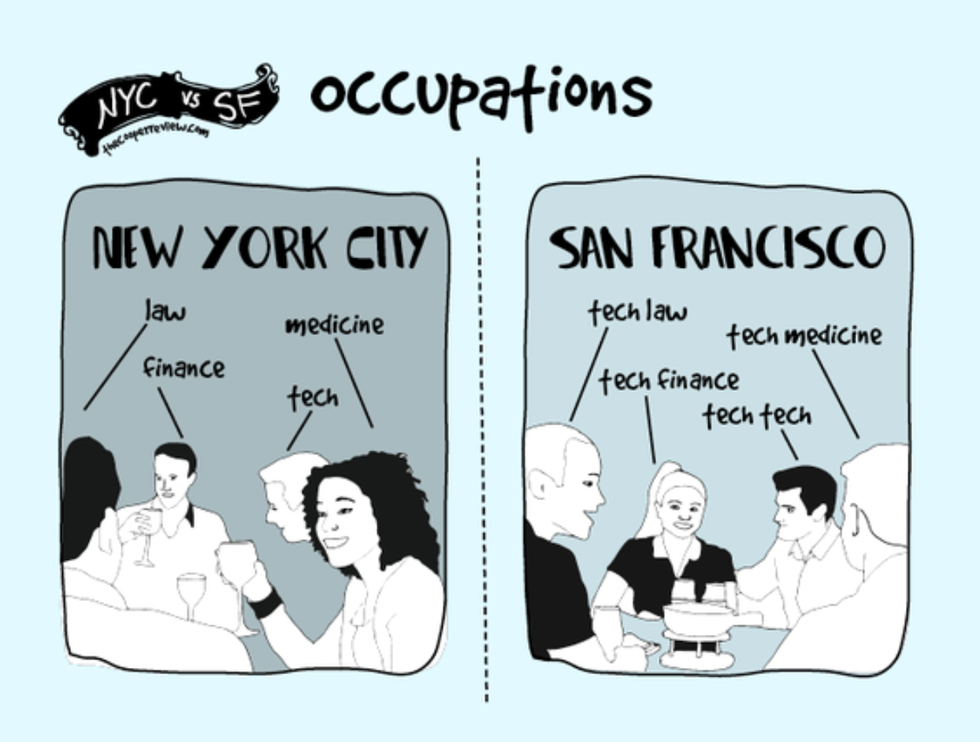 15. SF: ferries, car, BART, cable car, literally any transportation method ever NY: subway, subway, occasional taxi when desperate, subway, walk