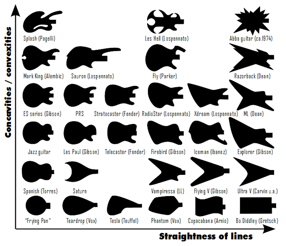 Notice that the most famous shapes (the Les Paul - named after jazz guitarist and guitar builder and innovator Les Paul - the Fender Telecaster and Stratocaster, and the Gibson ES series) employ cutaways - 'holes' in the otherwise figure 8 body they use - in different positions. While functionally the cutaways allow higher fret access and make it easier to play those strings, the cutaways add just a dash of crazy to the reliable sense of routine these guitars bring to the minds of the player.
