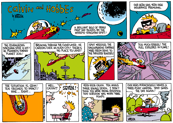 Calvin frequently adopts alternate identities in his daydreams, such as the frequently explored Spaceman Spiff.