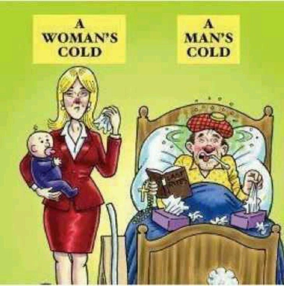 For cold and flu commercials, I’ve seen the father be weak and helpless, while even though the mother is ill, she presses on. More than not, a simple cold is not gong to bring down with parent to such a degree. They now they each have responsibilities and continue to do so.