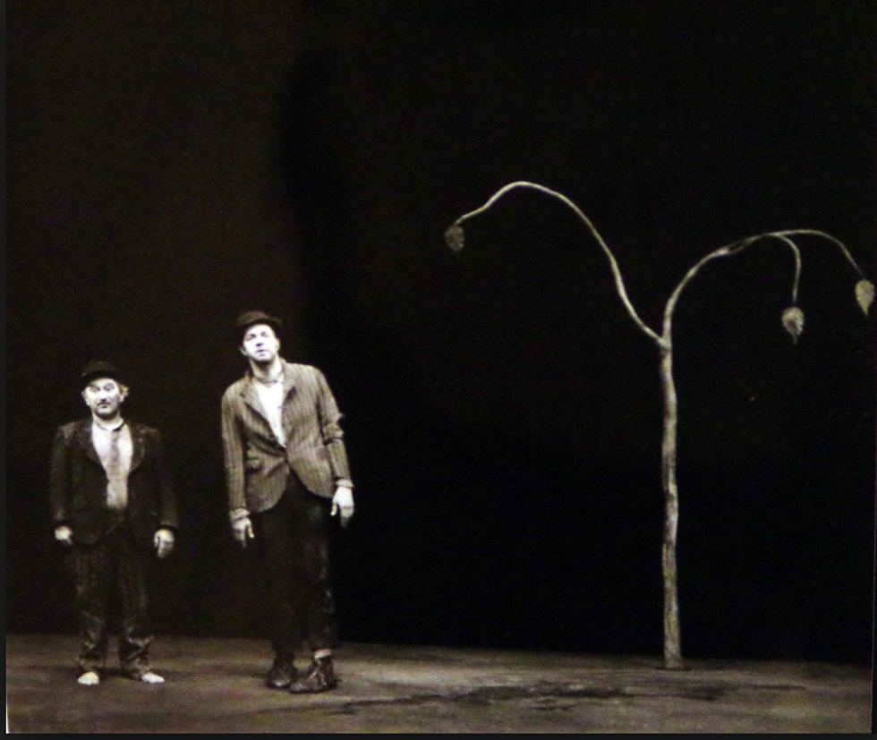 The plot follows two characters who await the coming of a mysterious figure named Godot. The whole play details their wait but Godot never arrives. It is set on a mostly empty stage apart from one leafless tree and a big boulder and is filled with slapstick humor and dark undertones with allusions to suicide.