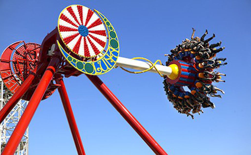 For people who like prefer a little less height, welcome to Electro Spin. The ride is a giant circular disc that spins along a giant half pipe. It's like the ultimate pirate ship effect, except that you can fall in any direction--face-down, backwards, or any type of sideways. Get ready for a spinny thrill that will have you walking in circles afterward!