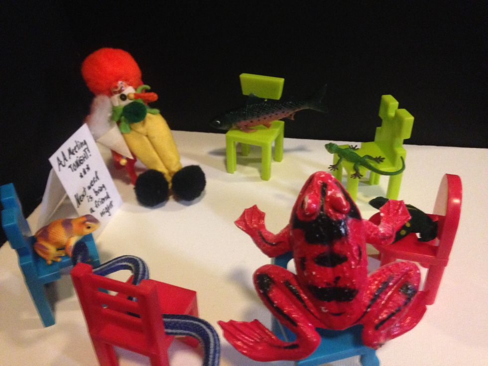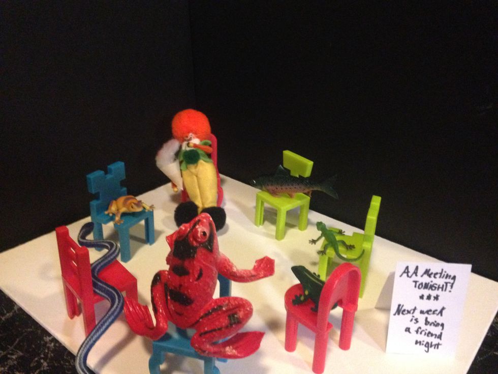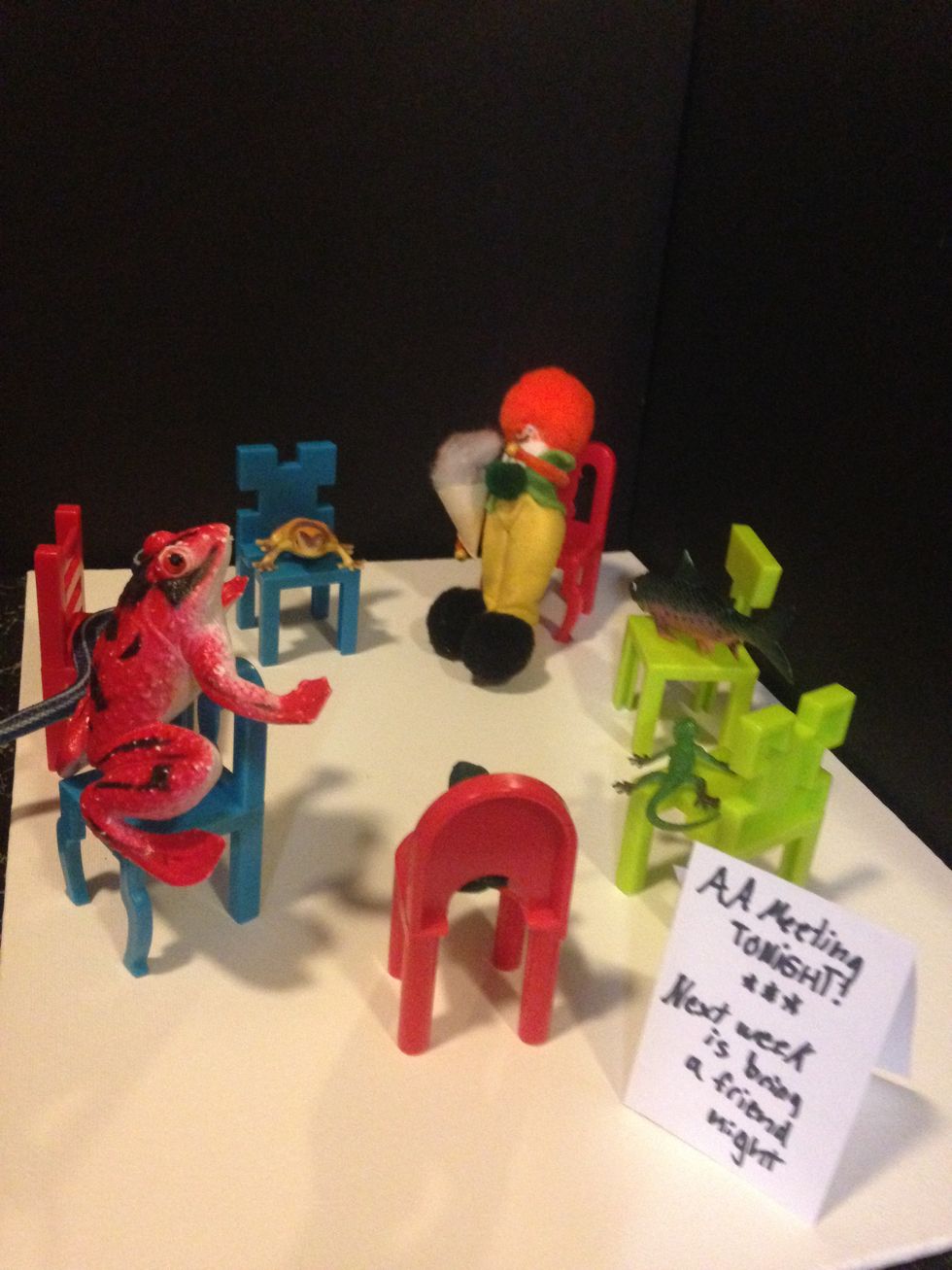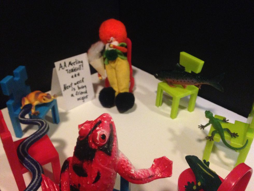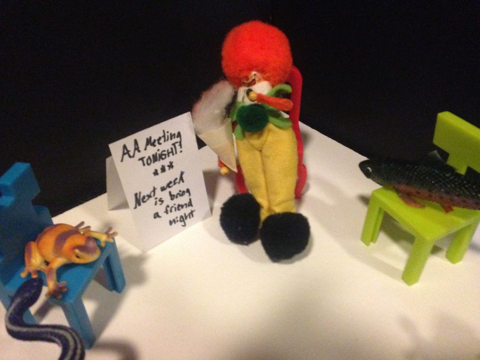 Tiny AA Meeting With Plastic Frogs and a Clown