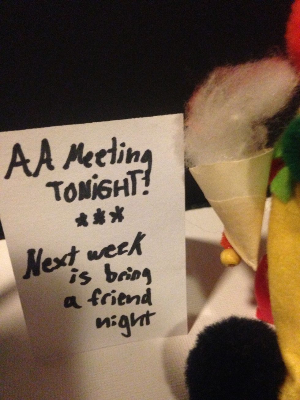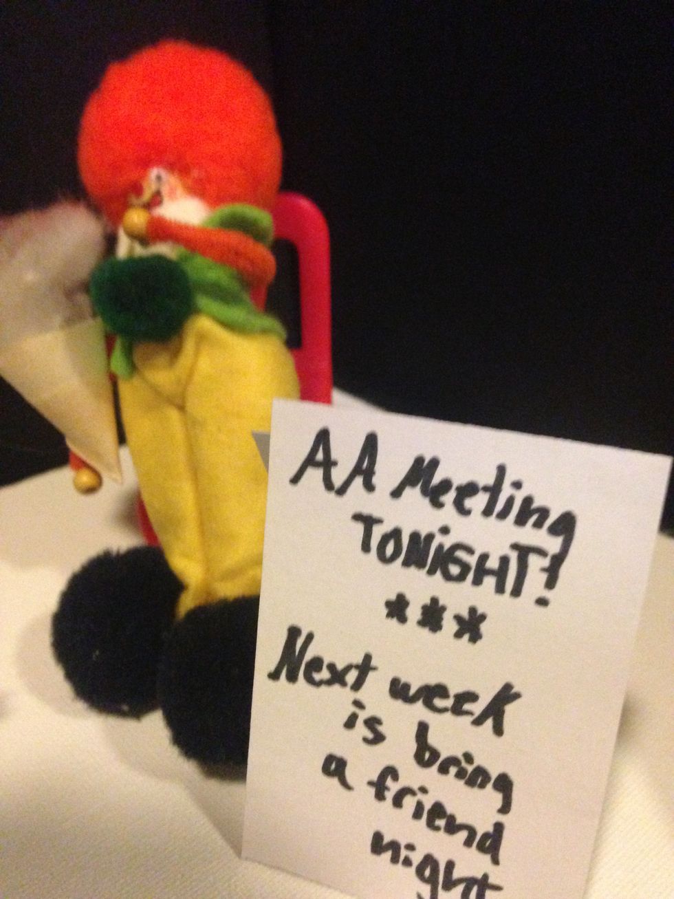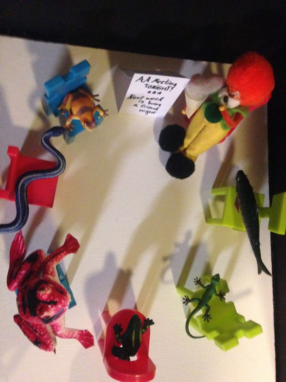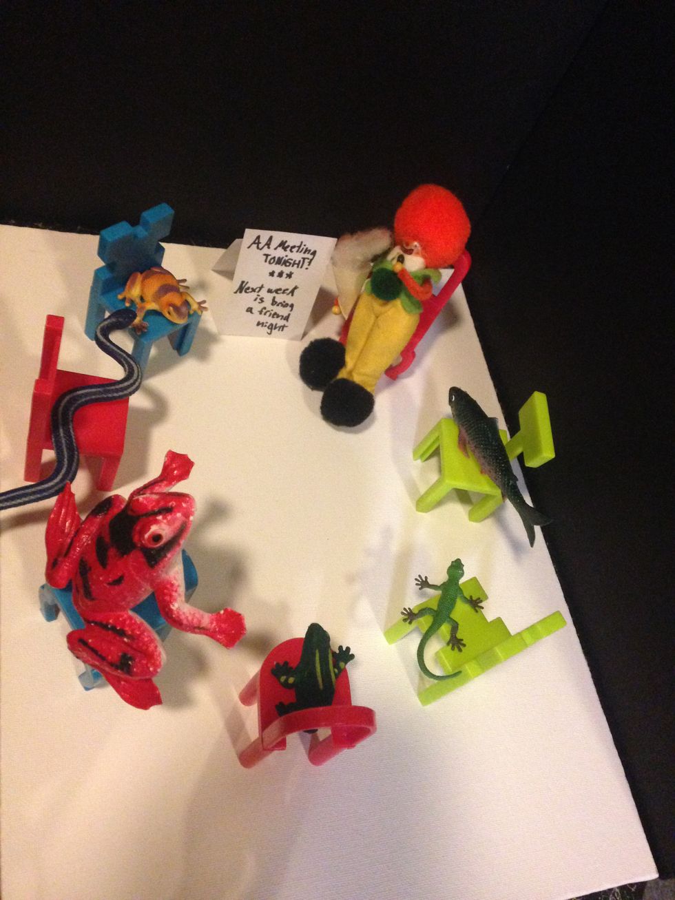 Tiny AA Meeting With Plastic Frogs and a Clown