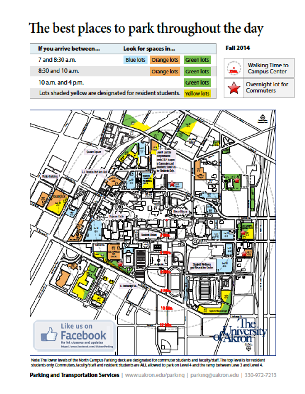 There are tons of lots around campus, so take a drive around the surrounding streets of the university—this will also help familiarize you with the area. Be sure to check out the lot right behind the BP off of East Exchange Street, because there are always spots there.