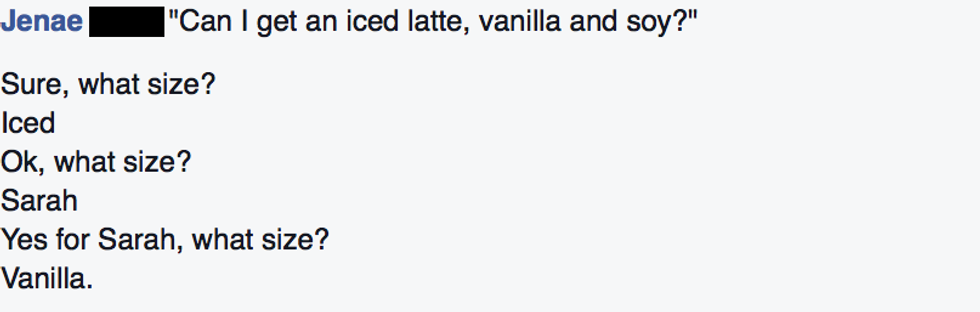 If you are talking on the phone with someone (please try to wait until your drink is ready), tell whomever you are talking with that you are at Starbucks and to hold on for one moment while you clearly recite your order without a phone at your ear.