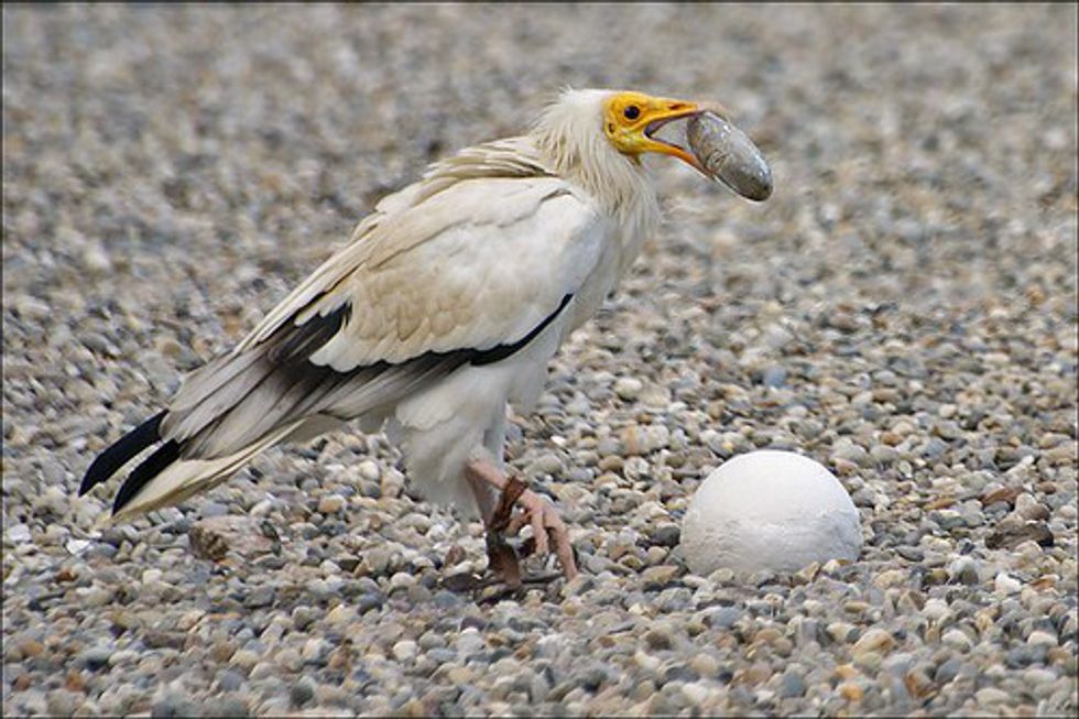 Parrots are not the only species known to use tools, as another species known to use tools is the Egyptian vulture (Neophron percno pterus). A species of raptor, these birds are generally detritivores, but are also known to eat eggs. In order to do this, Egyptian vultures will search within 50 yards for a rock, which the bird will then use to smash open the eggs, with an average accuracy of 40-60 percent. The motion used to throw rocks is also the usual pecking motion of these vultures, so it is believed that this learned trait developed when Egyptian vultures started using eggs as a food source.