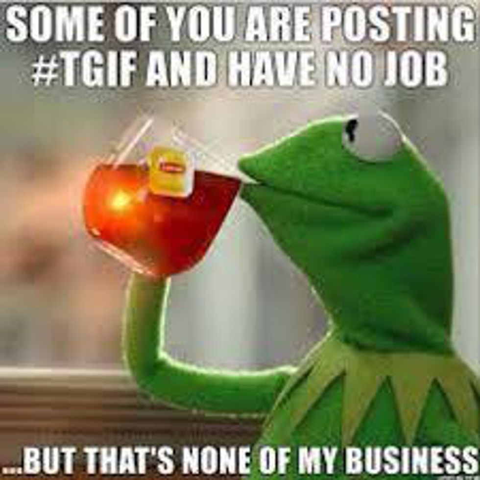 This is one of the Kermit the Frog memes. He has a couple that I know of, but this has to be my favorite. People started posting things like: "Your eyebrows are longer than your relationship, but that's none of my business" with a picture of Kermit sipping Tea. So it was pretty much a way for people to bash on other people, without it really being any of their business.