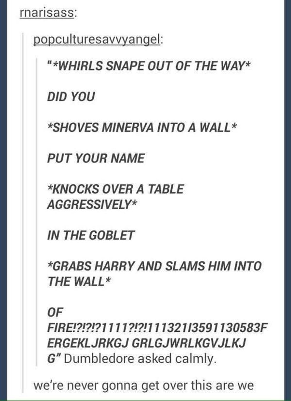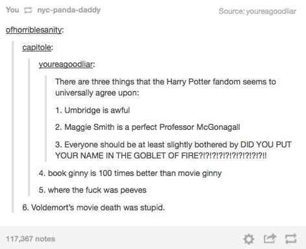 There are so many more Harry Potter posts on Tumblr but these are some of my favorites. There's an infinite collection of them ranging from hilarious, bringing Harry Potter into any conversation, and bringing up everyone who died in the series. Just a warning, the posts about Fred and George are the worst.