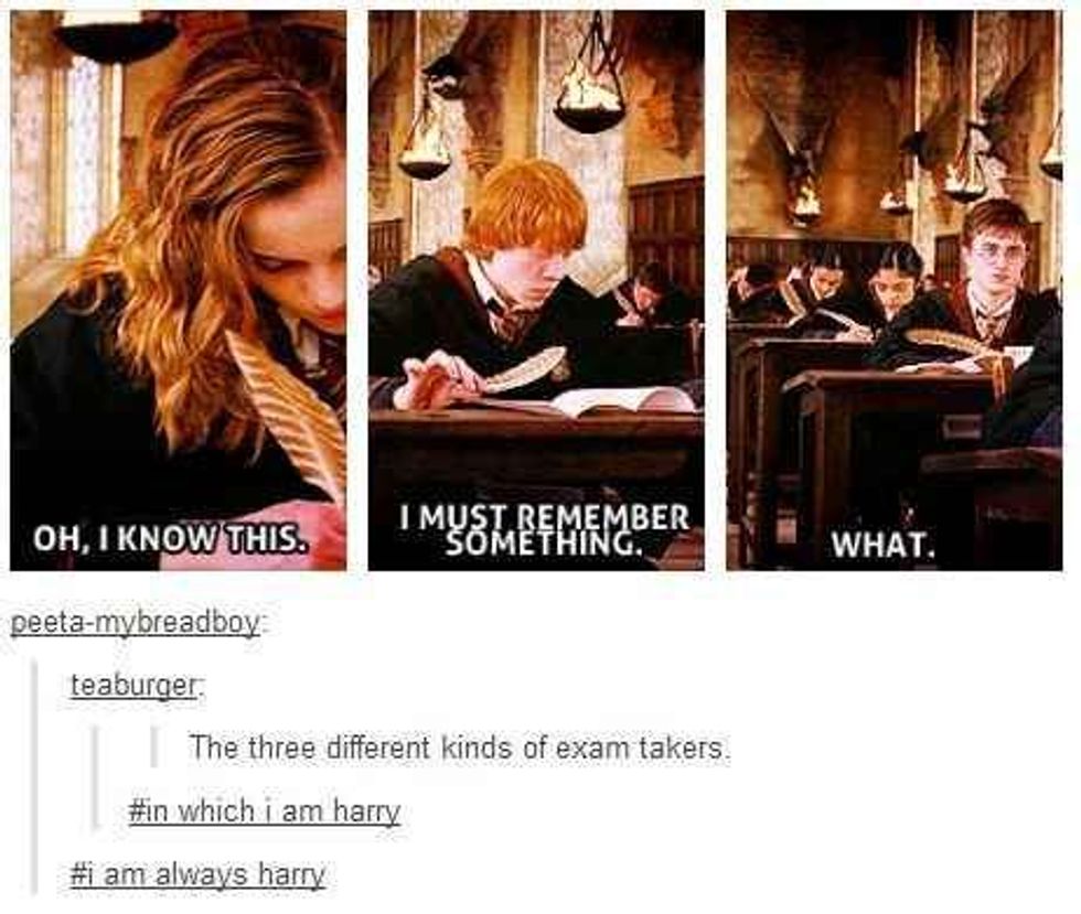 Let's be real, we all turn into Harry during midterm and finals week. If you're Hermione during either week, please tell us your secrets.