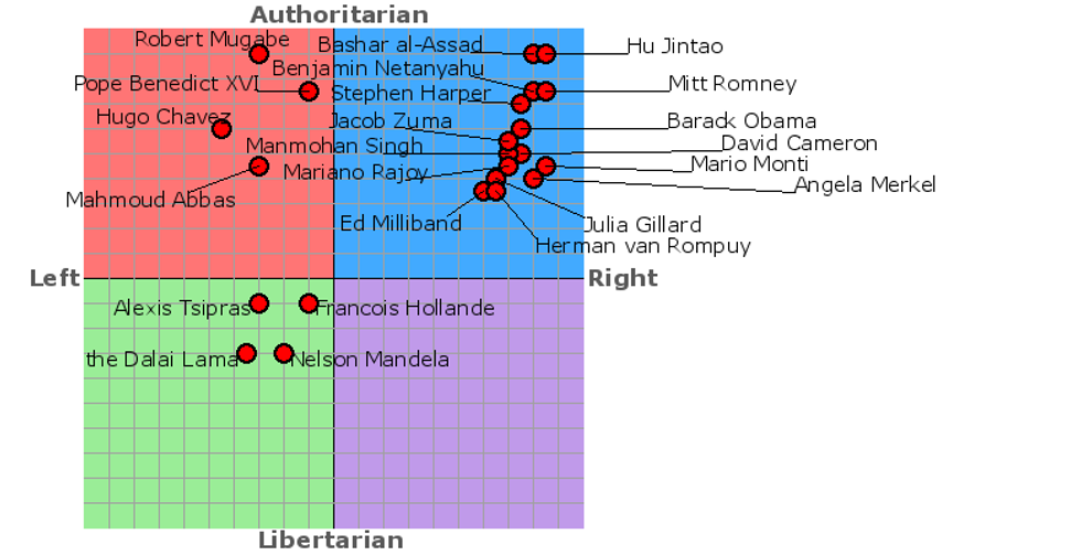 The Political Compass test is an online test made to give you an idea of where you stand politically. It was meant to break away from the linear system of just 'liberal' or 'conservative' and give you a better idea of what you think based on your views. As you can see, it uses a two-dimensional format, giving you a more in-depth look than the either/or system we currently use. It is fairly well known from what I can tell, and is often used to compare your views to those of others.