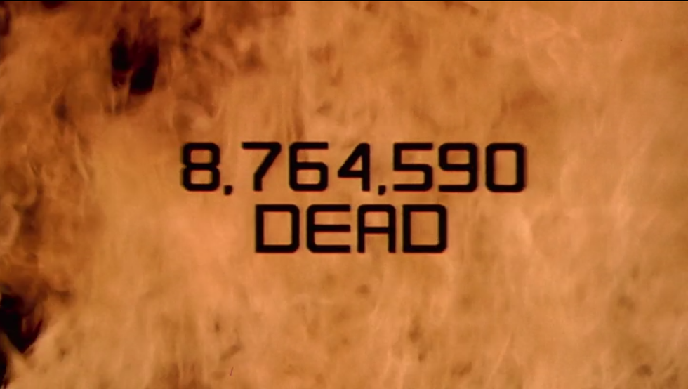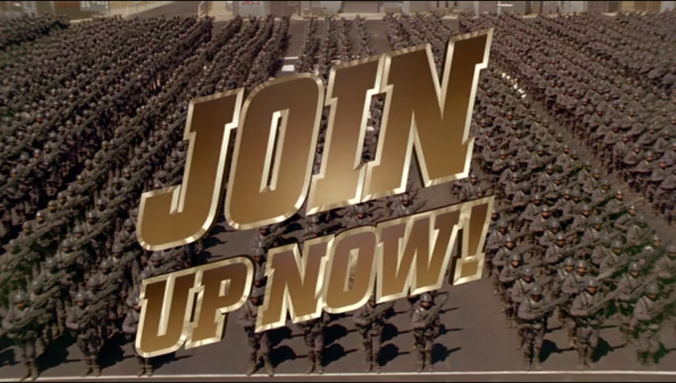 Technically the second shot, this image follows a quick shot of a commercial bumper that reads "Federal Network." Accompanied with an upbeat musical fanfare and the phrase "Join up now!" written in a bold golden font, the audience immediately knows that they are watching a patriotic military recruitment advertisement, which plays a huge role in this Fascist-Utopian film.