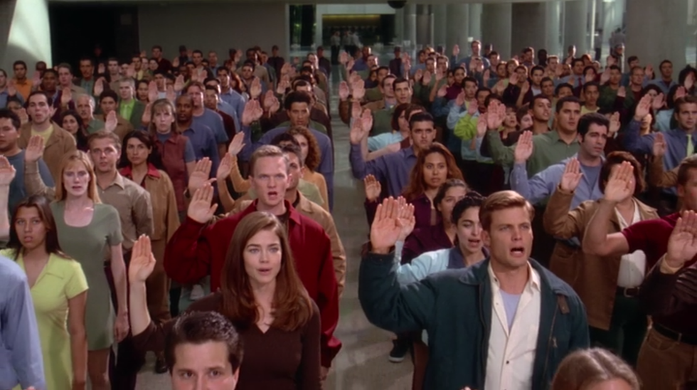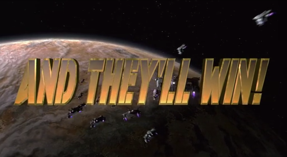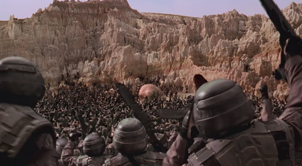 "Starship Troopers" ends with another military recruitment advertisement by the Federal Network, this time saying "And they'll win!" after a confident motivational speech on how humankind will triumph over the Arachnids. This drives home the message of how easily people can be seduced into putting their lives in incredible danger in exchange for what they perceive to be honor, glory, and "citizenship."