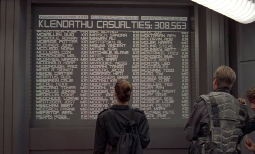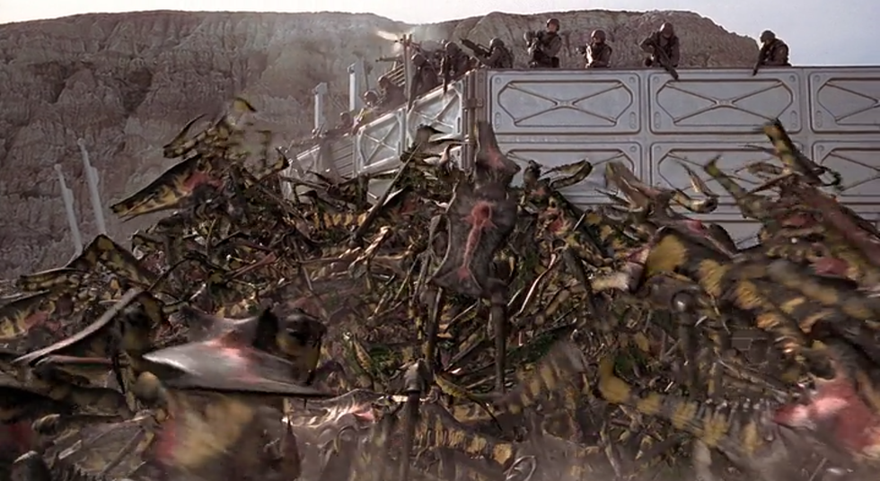 Humankind and the Mobile Infantry are dealt a crushing defeat in the first battle against the Arachnids. With over 300,000 casualties, this moment is seen as a defeat, but it is a false defeat since Johnny survives the battle, and the military begins to form a new and different plan of attack.