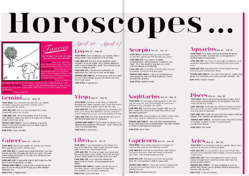 But these sources for astrological findings are unreliable. Do you really think that just because your favorite magazine says that Capricorns will meet their soul mate today, you will? I see people checking their horoscopes daily on a sketchy iPhone app and living their lives by it, resulting in them missing chances and opportunities to truly live. You can’t read one post or article about your zodiac sign and say, “Ohmygod, that is so me!” because the reality is that a lot of other people can relate to it too, even if they are a different zodiac sign. Astrology in the media are just generalizations to get readers to buy more of what they are selling. And sometimes, the horoscopes simply don’t make sense at all.
