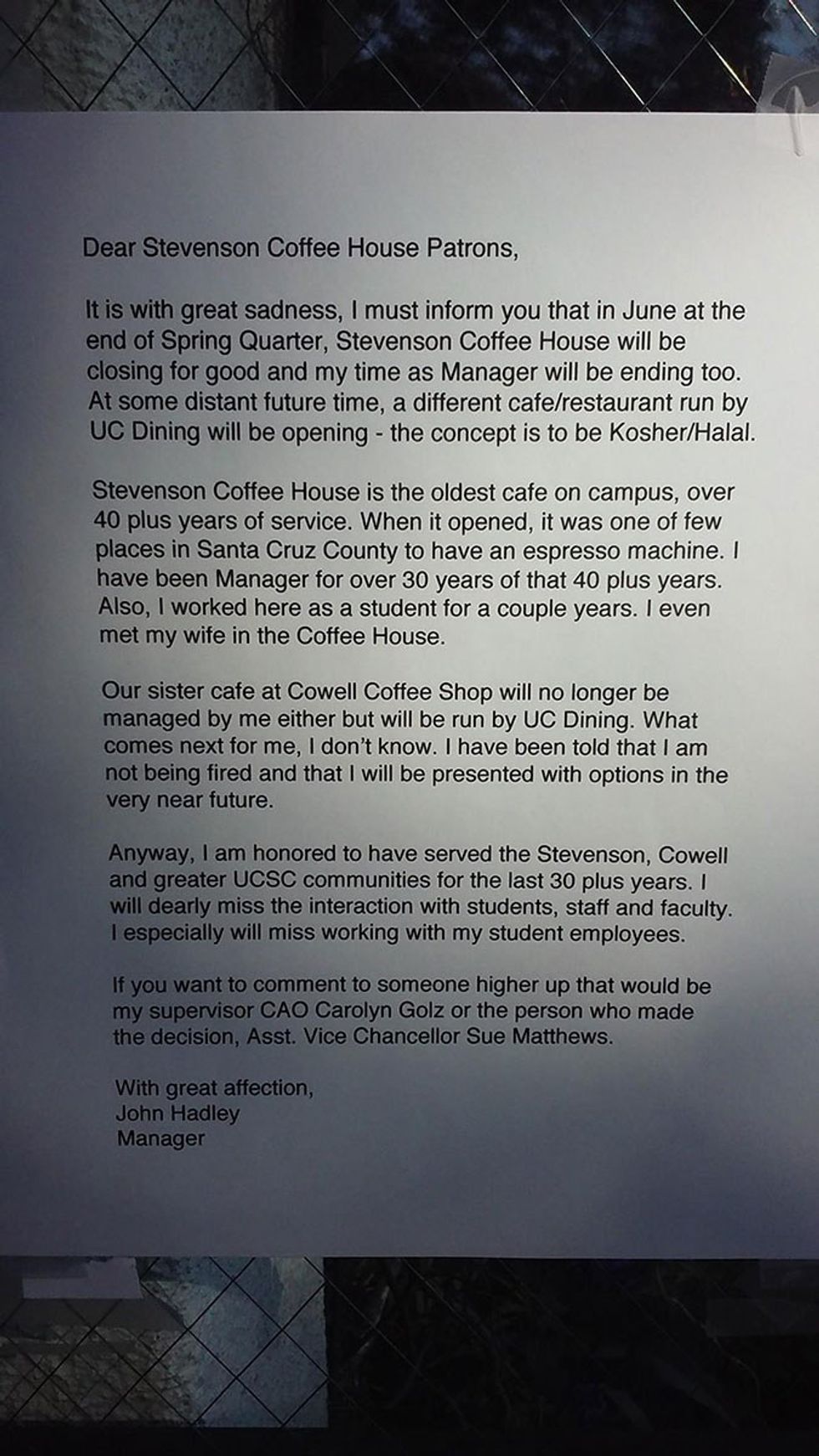 I am affiliated with Stevenson college and have incredibly fond memories of my first year living on campus and participating in the many college-specific experiences offered, such as events and college nights at the Stevenson Event Center, studying at the Fireside Lounge, smoking cigarettes (when it was legal on-campus) at the ship-shaped wooden bench, late night vending machine snacks, ping pong in the Stevenson Recreation Room and even later nights spent studying in Stevenson's 24-hour library adjacent to the dorms. This spring, I will be graduating and walking with a couple hundred of my fellow Stevenson students. On this same weekend, however, another Stevenson institution of upwards of 40 years will be closing: the Stevenson Coffee House. Just a few weeks ago, the notice of the closure was posted with this letter: