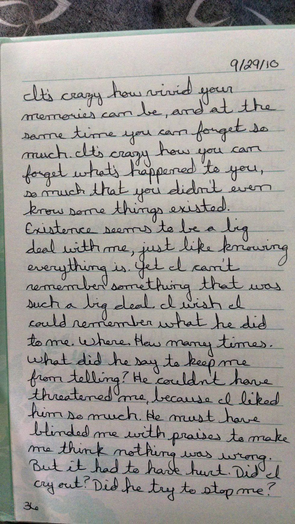 "I wish I could remember what he did to me. How many times. What did he say to keep me from telling? He couldn't have threatened me, because I liked him so much. He must have blinded me with praises to make me think nothing was wrong. But it had to have hurt. Did I cry out? Did he try to stop me? I remember feeling awkward when he told me to take my clothes off by the fireplace. Five-year-olds don't understand the meaning of nakedness. I shouldn't have been scared. What had he done to me to make me wary of my body at such a young age?"