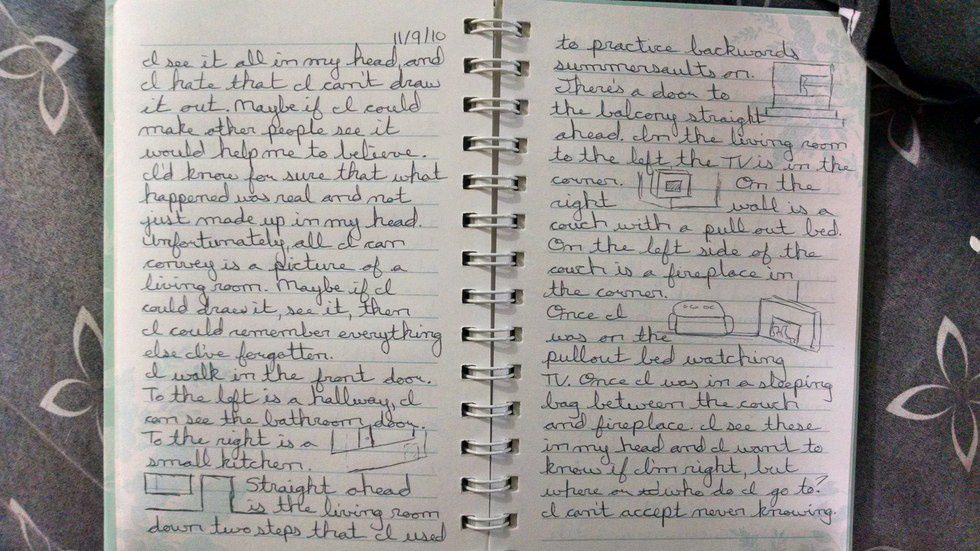 "I see it all in my head, and I hate that I can't draw it out. Maybe if I could make other people see it would help me to believe. I'd know for sure that what happened was real and not just made up in my head. Unfortunately, all I can convey is a picture of a living room. Maybe if I could draw it, see it, then I could remember everything else I've forgotten. I walk in the front door. To the left is a hallway, I can see the bathroom door. To the right is a small kitchen. Straight ahead is the living room down two steps that I used to practice backward somersaults on. There's a door to the balcony straight ahead. In the living room to the left the TV is in the corner. On the right wall is a couch with a pull-out bed. On the left side of the couch is a fireplace in the corner. Once I was on the pullout bed watching TV. Once I was in a sleeping bag between the couch and fireplace. I see these in my head and I want to know if I'm right, but where or who do I go to? I can't accept never knowing."