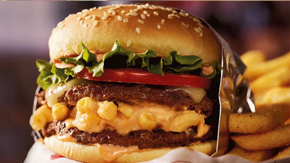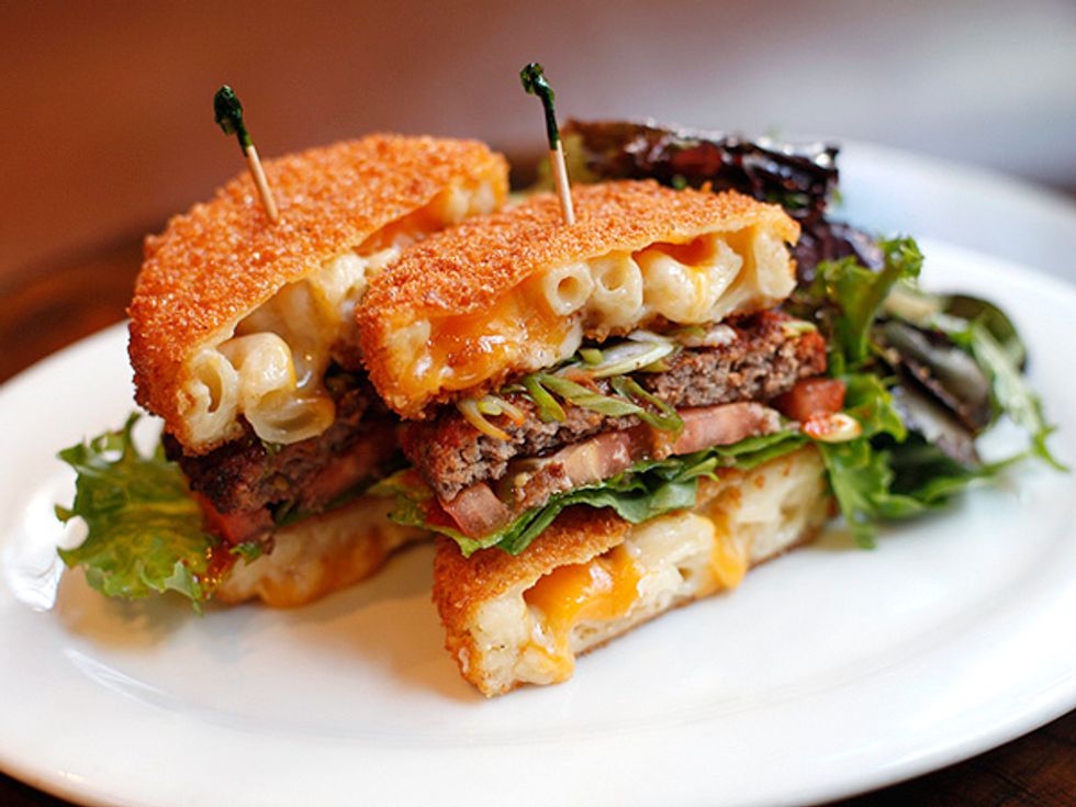 If more of a meal (or a delicious heart attack) is what you're looking for, mac & cheese burgers are the way to go. I mean, don't get me wrong, regular cheeseburgers are delicious, but adding the mac just takes it to a whole other level. But if you think mac & cheese on a burger is crazy, check this out: