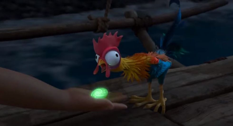 Everyone can grow, whether they believe it or not. Throughout the movie, Heihei seems like nothing but, well... a dumb chicken. When it really matters, though, he pulls through and gives Moana the Heart of Tefiti instead of swallowing it like he's done with all the other rocks he'd encountered in the movie.