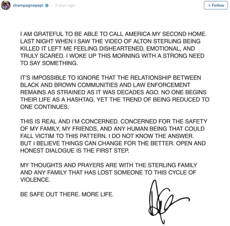 The events that took place during the past week are unfortunately not surprising, and they are gaining full attention from the President of the United States and famous individuals such as Beyoncé. She posted about this on her website. Drake also posted on his Instagram. Everyone is talking because they want to see a change. Social media platforms have given us the availability to see outraged reactions of famous athletes, politicians, and our role models due to the death of both Alton Sterling and Philando Castile. They were both tragically shot and killed by police early last week.