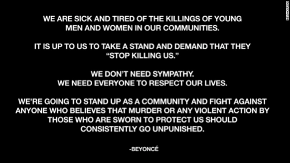 We have the President of the United States in front of us speaking about the issue but there are thousands of others whose voices matter – whose voices we look up to. The article on CNN, “Beyoncé pays tribute to Alton Sterling and Philando Castile at concert”, by Donie O'Sullivan and Megan Thomas reads that Beyoncé made her fans at her concert in Scotland aware of the gentlemen who were killed during the past including the previous week. Making people aware of the situation is what everyone needs to do. Beyoncé also posted on her website something that is grabbing attention from many which includes, “We’re going to stand up as a community and fight against anyone who believes that murder or any violent action by those who are sworn to protect us should consistently go unpunished”. Simply put, there is going to be a change.
