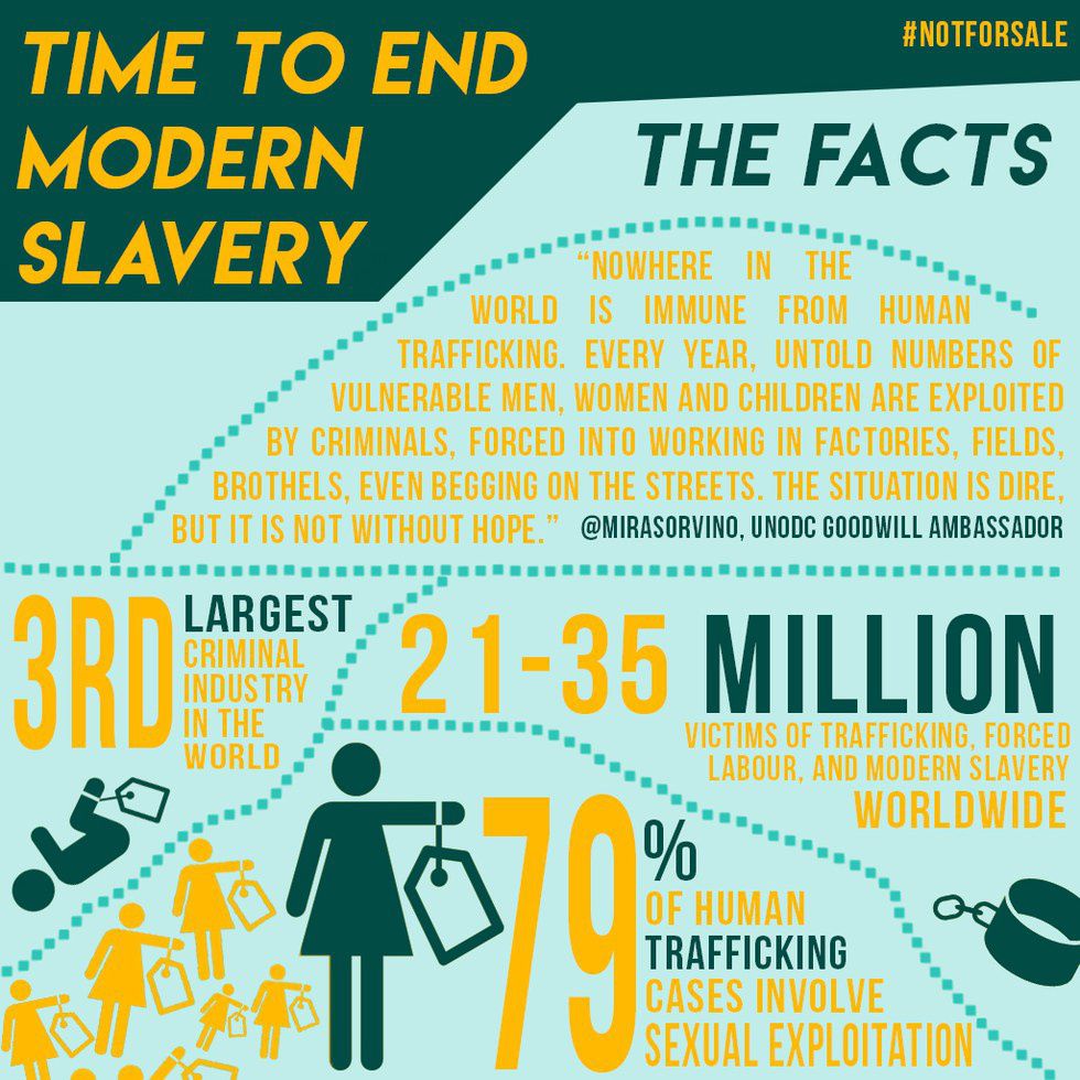The United Nations Office on Drugs and Crime website reports, “Every year, thousands of men, women and children fall into the hands of traffickers, in their own countries and abroad. Almost every country in the world is affected by trafficking, whether as a country of origin, transit or destination for victims.” Those who are most susceptible to human trafficking include runaway and/or unsupervised children (mostly girls), and undocumented immigrant children. According to Polarisproject.com, a 2014 study shows that one in every six runaway children is likely to a child sex trafficking victim. 20.9 million people around the world are denied freedom and basic human rights as a result of human trafficking.