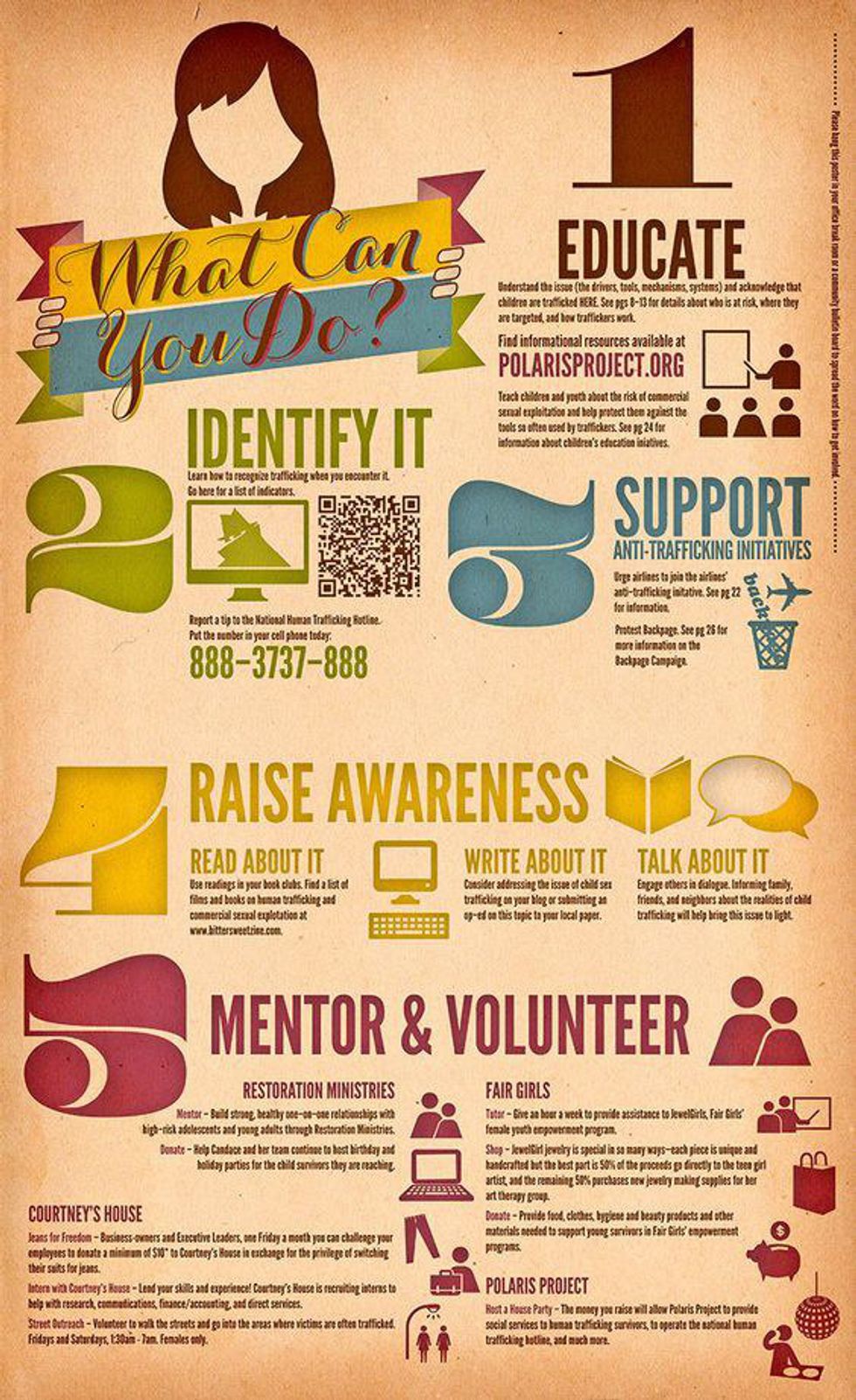The numbers are horrifying, but with growing technology and resources, people can become more informed on the subject and create change, no matter how small. Human trafficking is a huge industry, all over the world, yet it remains a severely under-discussed topic. The U.S. Department of State Website has published a list of “20 Ways You Can Help Fight Human Trafficking,” which includes information like the 24/7 hotline number for the National Human Trafficking Resource Center (1-888-373-7888), a list of goods produced in certain countries that use child labor, and links to various outreach, volunteer, awareness, and fundraiser groups. Watch documentaries. Have conversations. Spread awareness so the issue does not continue to be ignored while the industry continues to grow.