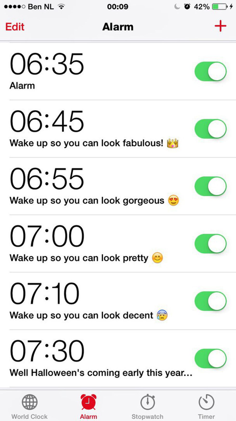 You'll thank me later. Because I live 25 minutes away. and either Im 30 minutes early or 10 minutes late. And being late IS NOT a good reputation to have in college. It annoys the professors, and sometimes effects your grade, and performance in the class itself. So just set the extra alarms, and DON'T SPEED. Don't need to be getting in an accident before school. So be safe, not late.