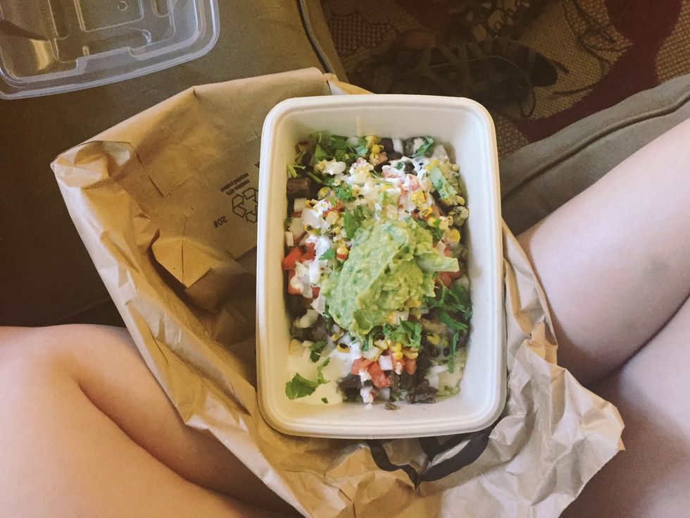 The very burrito bowl I just ate, with queso AND guac. YUM.